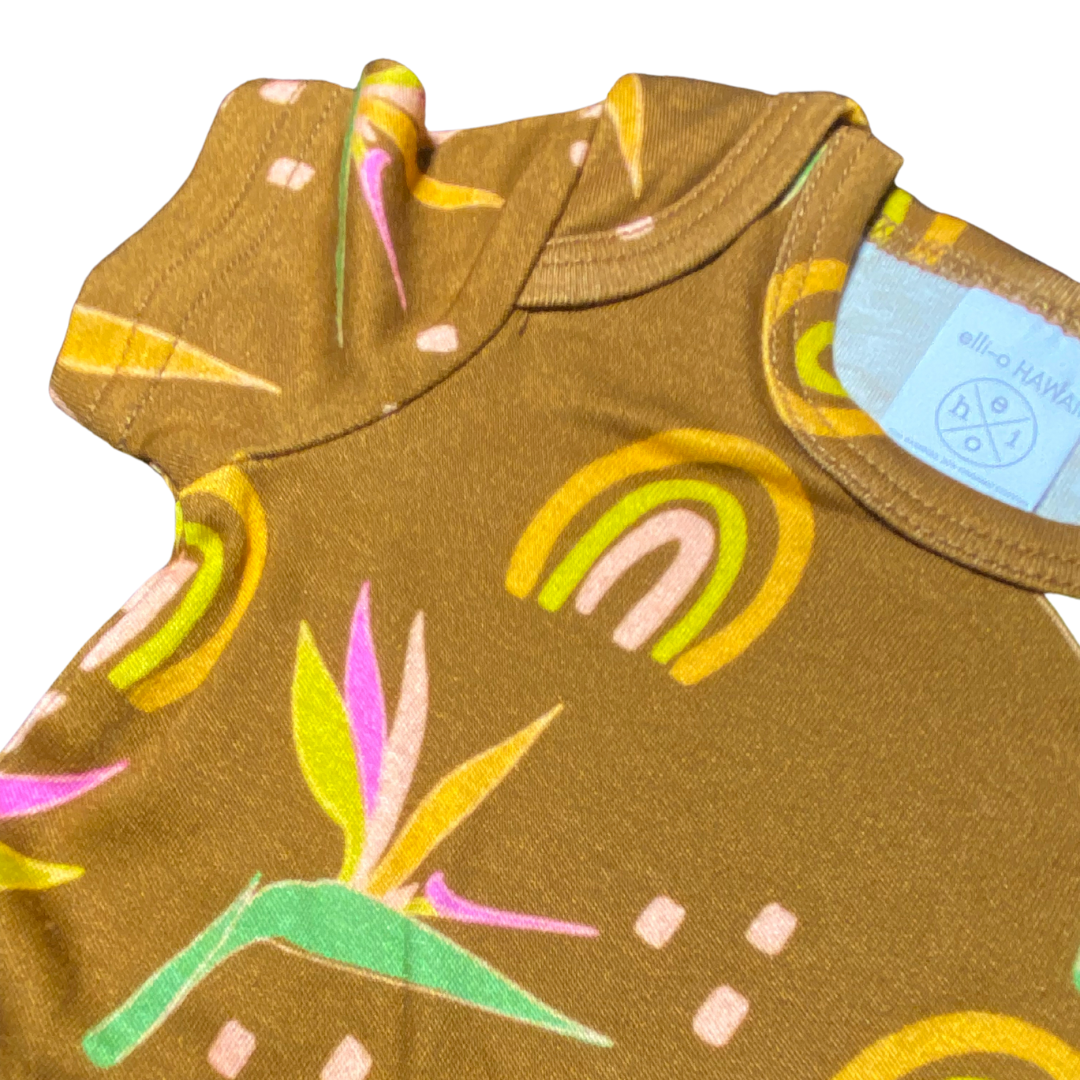 The ‘retro paradise’ print highlights the bird of paradise, a flower that adds it beauty our to floral arrangements and grows in the backyards of many homes here on the islands. All of elli-o HAWAII's fabrics feature original prints designed in the special town of hilo, on the big island. We focus on making easy to live and play in pieces that will remind you of old Hawaii. Relaxed retro style!