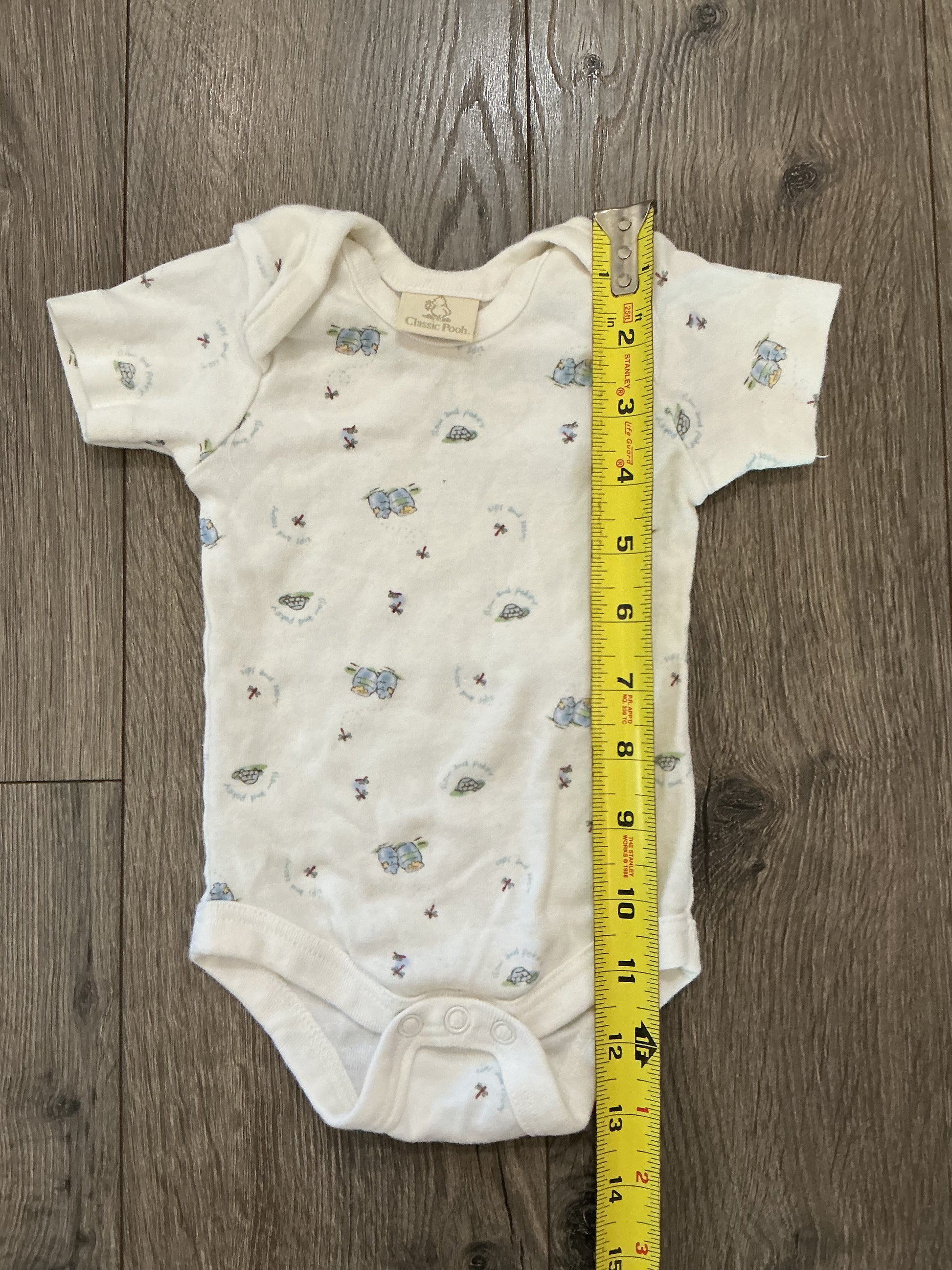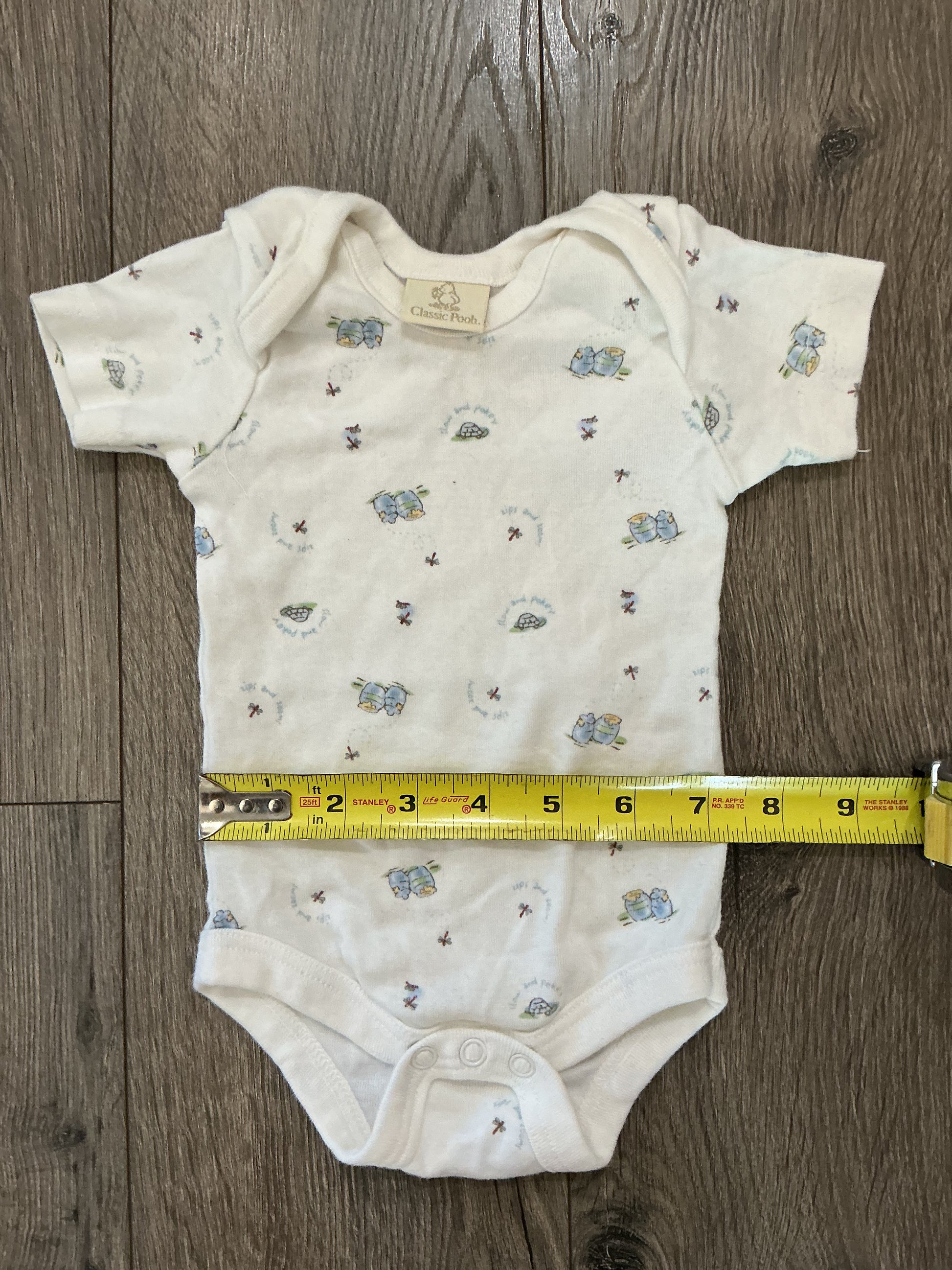 The vintage classic Pooh romper is a one-piece outfit designed for infants aged 3-6 months. Featuring a charming blue, white, and yellow color palette with a turtle and honey motif, it offers a comfortable fit for your baby. This item is new without tags and shows no damages, ensuring a high-quality addition to your child's wardrobe.